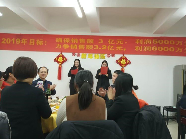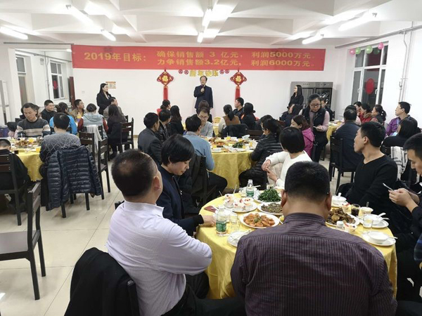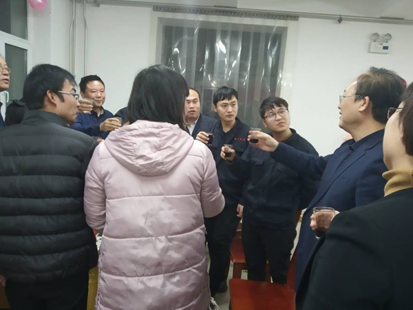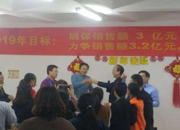 銷售部王云濤總,傾情提了四杯酒,敬董事長,敬自己,敬幕后人員。郝總代表大家為王總斟了一杯大酒,希望他2019年業(yè)績所向披靡,拿下5000萬目標(biāo)。他中招干了半杯,銷售酒量一般都是兩斤啊,神勇。后勤部王震山總勇猛做陪,一起炸了半杯。