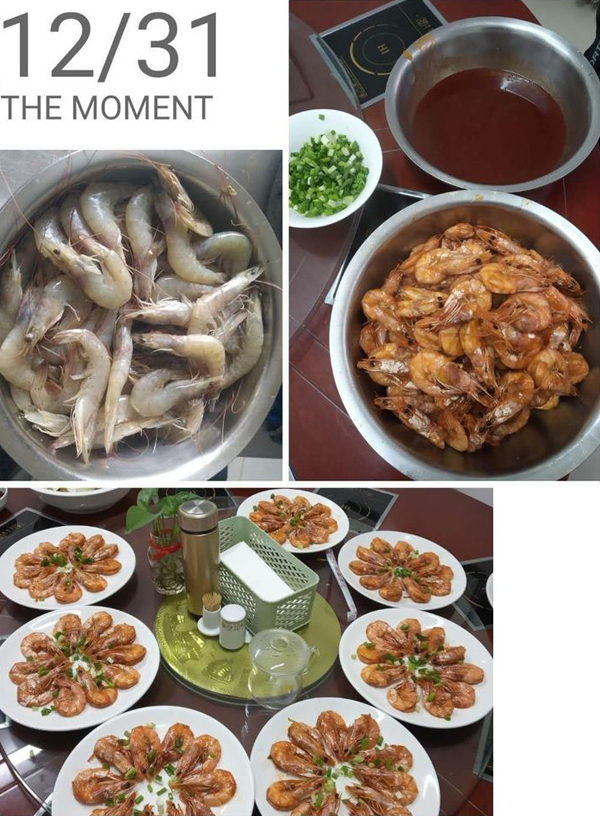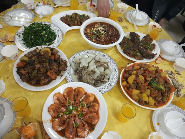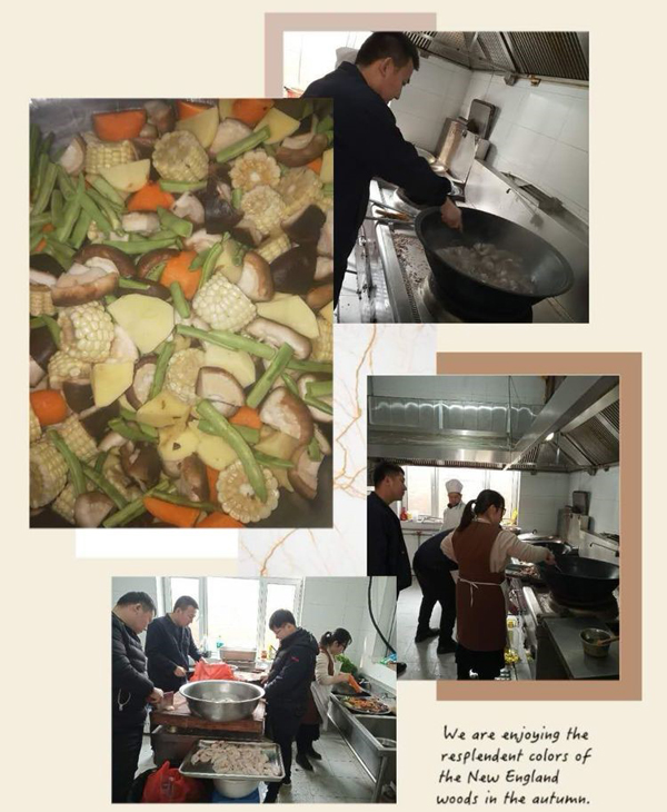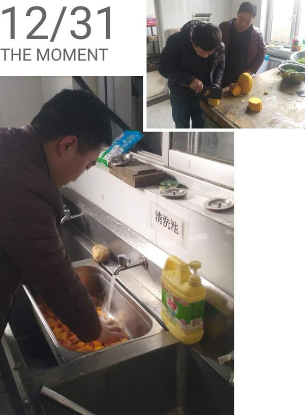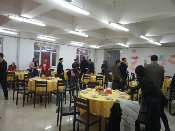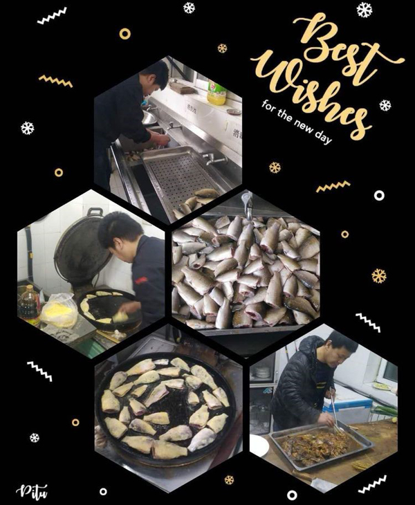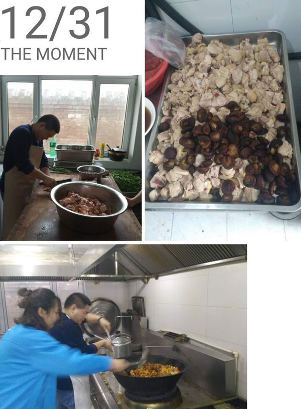 大家伙共同布置我們的會場,貼福字,掛條幅,換桌布,有些同事自己從家里拿案板與廚具。四星也是我們的家。