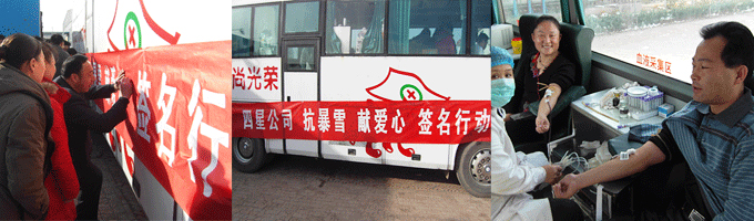 于2010年11月,河北省遭遇60年罕見的暴風(fēng)雪,相關(guān)地區(qū)受災(zāi)嚴(yán)重,一方群眾急需血液,但血庫供血告急,當(dāng)公司接到上級政府救援通知后,及時動員全體職工無償獻(xiàn)血,奉獻(xiàn)愛心活動。